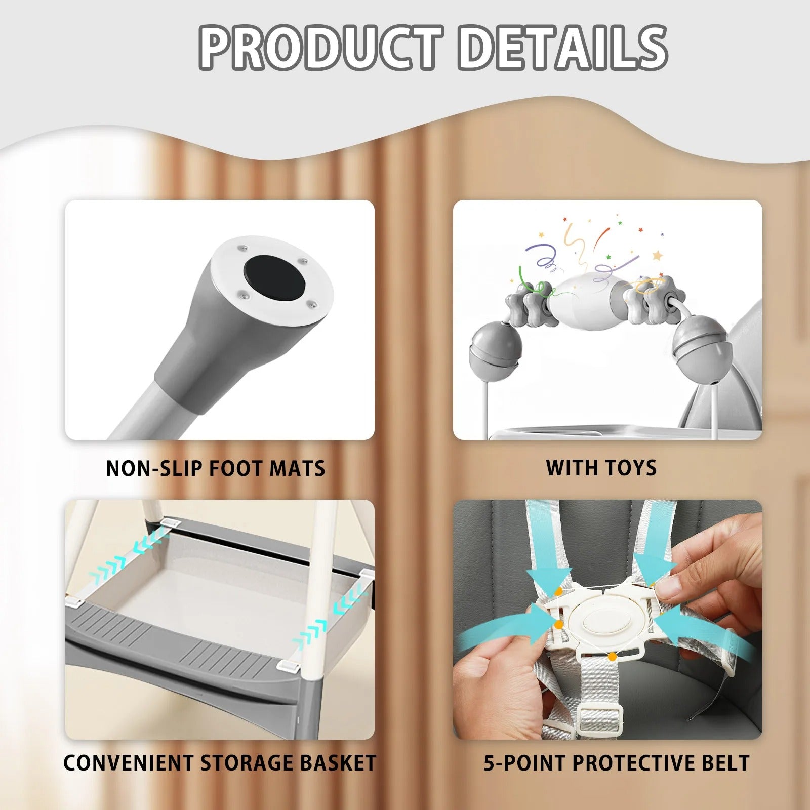 Equipped with a supportive seat and safety harness to keep your baby secure.